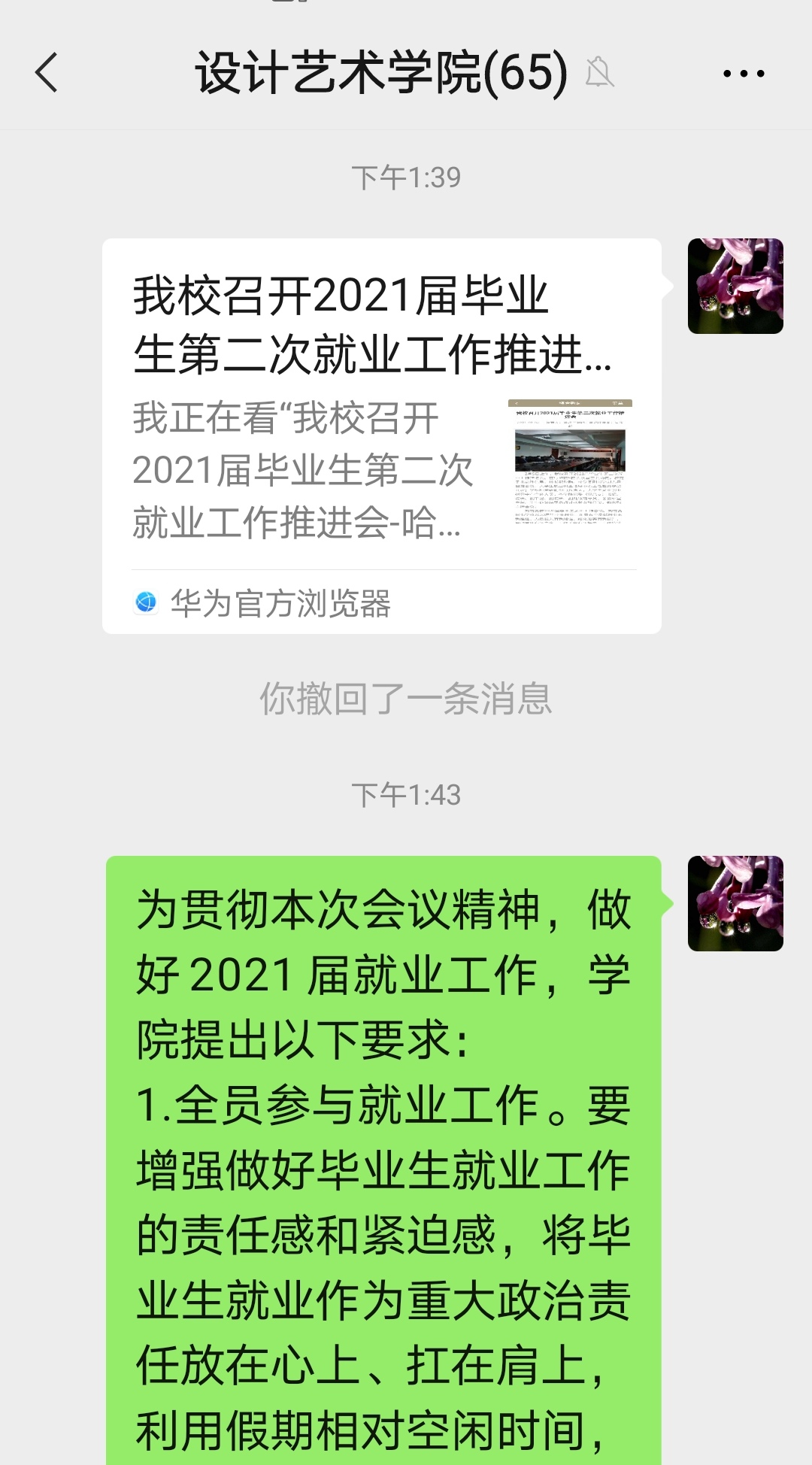 2月7日下午,学院利用微信群传达了我校召开的2021届毕业生第二次就业工作推进会议精神。学院就业工作领导小组进行了工作安排。谭士元书记通报了各个专业的就业率。王宝成院长提出了工作要求。