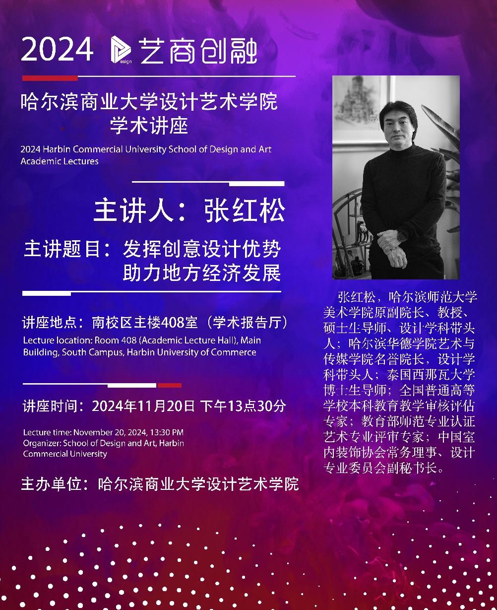 主讲嘉宾——张红松教授,哈尔滨师范大学美术学院原副院长、教授、硕士生导师、设计学科带头人;哈尔滨华德学院艺术与传媒学院名誉院长,设计学科带头人;泰国西那瓦大学博士生导师;全国普通高等学校本科教育教学审核评估专家。在张红松教授的引领下,我们开启了一场全面且深入的创意设计产业探索之旅,收获颇丰。