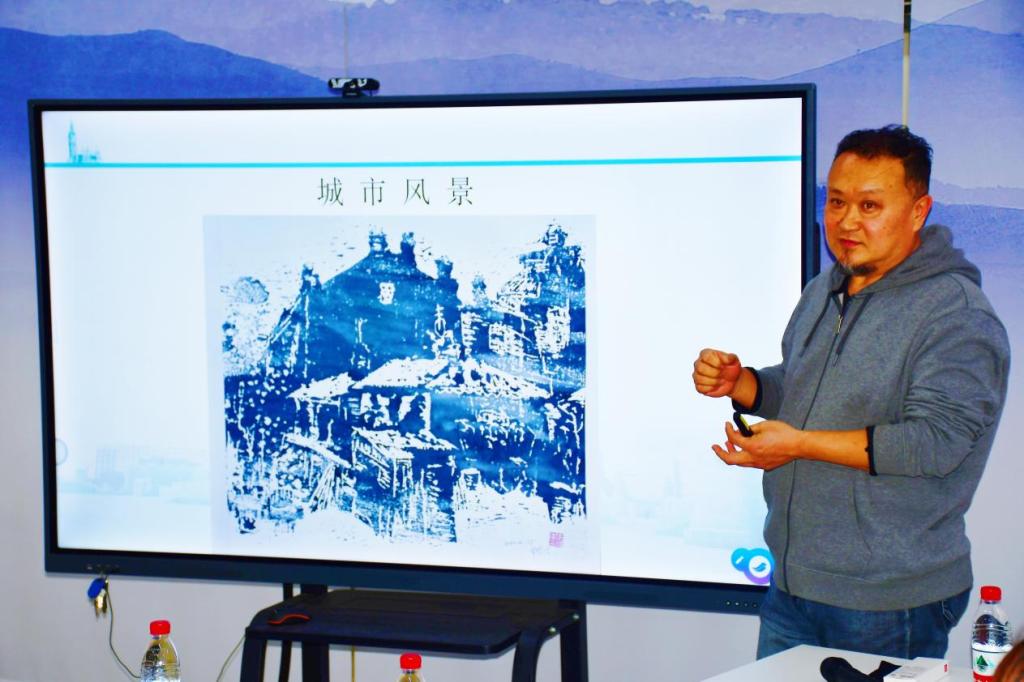 盛琰老师1991年毕业参加第十八届哈尔滨冰灯游园会设计工作,至今共参与了三十届的冰灯游园会的设计与施工工作。2010年至今连续十年参与哈尔滨市政府承建的哈尔滨城区冰灯景观建设的规划及设计与施工管理工作。2000年至今一直从事冰版画的研究和创作工作并有近百幅作品面世。盛琰老师对冰版画的起源、发展进行了详细阐述,聚焦冰版画这一独特艺术形式,深入挖掘其起源与发展脉络,让大家清晰地了解到冰版画从萌芽到逐步发展的历程。在分享优秀冰版画案例环节,盛琰老师通过展示多幅具有代表性的作品,以其精妙绝伦的线条勾勒与独特的色彩运用,展现出冰版画在刻画细腻情感方面的强大表现力,进一步阐释冰版画的艺术魅力,为在场听众带来了一场知识与艺术交融的盛宴。