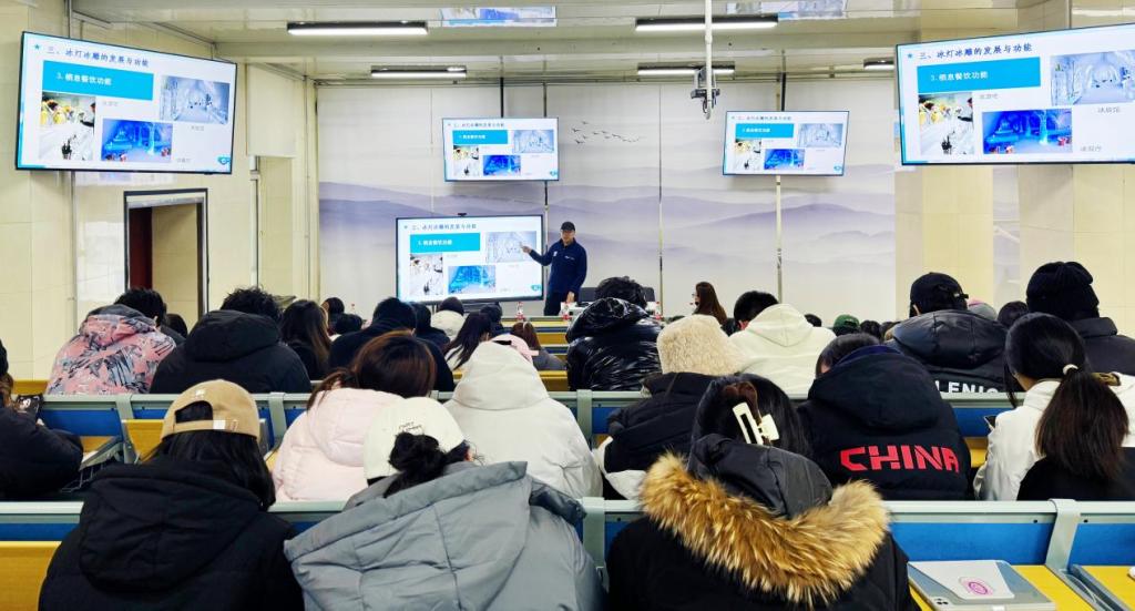 讲座现场,嘉宾们分享了自己与冰雪艺术的深厚渊源,详细介绍了哈尔滨地区冰雕艺术的历史渊源与发展,并分享了冰雕创作的技巧与心得,从创意构思的萌发,到如何将艺术理念与商业需求有效结合,再到实践操作中的工具选择、技术应用与团队协作。